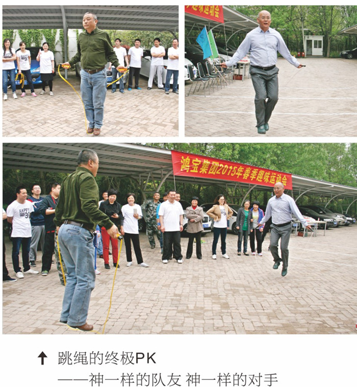 當(dāng)天的比賽項(xiàng)目為個(gè)人跳繩、集體跳大繩、拔河比賽,各隊(duì)隊(duì)長帶領(lǐng)團(tuán)隊(duì)投入了比拼。跳繩是充滿活力的運(yùn)動,在精力充沛的鴻寶人的熱情參與下,顯得更加活蹦亂跳、生機(jī)勃勃、斗志昂揚(yáng)。“一、二、三……”為了集體的榮譽(yù),齊心協(xié)力,運(yùn)動員們使出渾身解數(shù),跳繩被甩得飛快,不時(shí)被跳繩絆住,但立即又調(diào)整……個(gè)人跳繩后,集體跳大繩比賽開賽啦!跳大繩最考驗(yàn)的是團(tuán)隊(duì)的配合,任何一個(gè)隊(duì)員的失誤都會影響整個(gè)團(tuán)隊(duì)。只見大繩有節(jié)奏、有韻律地凌空搖著,參賽隊(duì)員們協(xié)調(diào)一致、輕盈地跳進(jìn)跳出,圓滿地完成了各隊(duì)的任務(wù)。