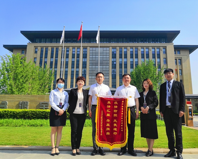 鴻寶集團黨委書記鄧和平、鴻寶物業總經理李真、副總經理鄭偉鵬及相關工作人員代表全體疫情期間堅守一線的鴻寶人接受錦旗。