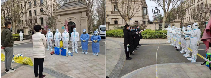 面對突如其來的封控,小區業主一開始充滿了不安、驚慌、還夾雜著些質疑和抱怨,外圍工作人員同樣馬不停蹄連軸作戰。他們耐心安撫業主恐慌情緒,真誠服務給業主吃下“定心丸”。他們頂著寒風在現場維護秩序,在24小時內配合疾控部門開展全面徹底的環境消殺,逐家逐戶完成信息登記和人員排查,在72小時內完成三天兩檢400余人次。當得知小區內部有三名裝修工人滯留時,項目團隊主動為其提供被褥食物,幫助其安心度過隔離期,彰顯出“用愛匯真情”的人文關懷。