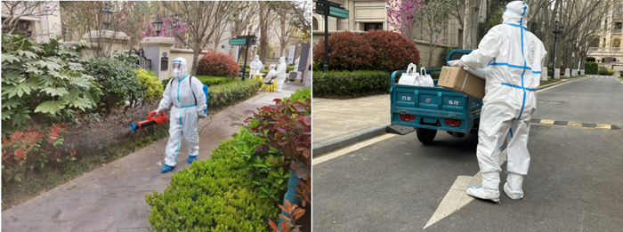 次日一早,鴻寶物業組織抗疫動員會,正式吹響抗疫集結號。因小區全封閉管理,項目人員全部轉移至外圍工作。但小區內57戶200余名業主的日常生活需求同樣不容忽視,為確保疫情防控和物業服務兩不誤,來自基層崗位四個部門的六名員工常永安、蔡小銀、楊志、李志建、牛鑫杰、高坤響應號召,在傳播鏈條不清晰、防控趨勢不明朗的嚴峻形勢下,主動請纓擔任抗疫志愿者,清晨06:30便集合到位,以大無畏精神毅然決然地深入封控小區最前線,化身全副武裝的“大白”,實時響應業主需求,執行物資配送、環境消殺、垃圾轉運、工程維修等各項任務。面對超出常規的工作量和前所未有的抗疫壓力,他們竭盡全力,不辭辛苦。楊志、李志建是專門負責物資配送的“大白”,每日一趟趟往返奔波在小區門崗與各家各戶之間,僅3月30日一天便為業主配送生活用品、快遞多達133件。
