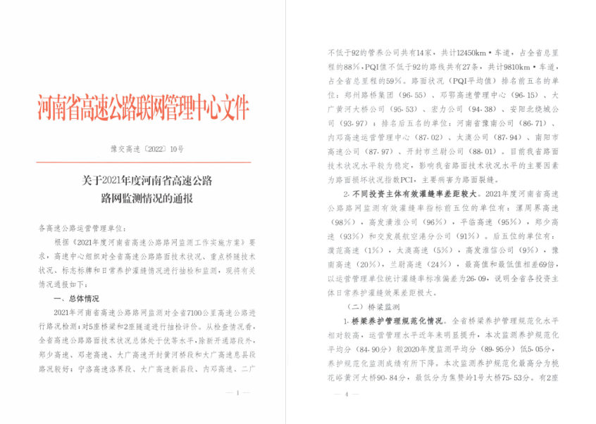 5月16日,河南省高速公路聯網管理中心下發《關于2021年度河南省高速公路路網監測情況的通報》文件,通報前期對全省高速公路路面技術狀況、重點橋隧技術狀況、標志標牌和日常養護灌縫情況進行抽檢、監測的結果。