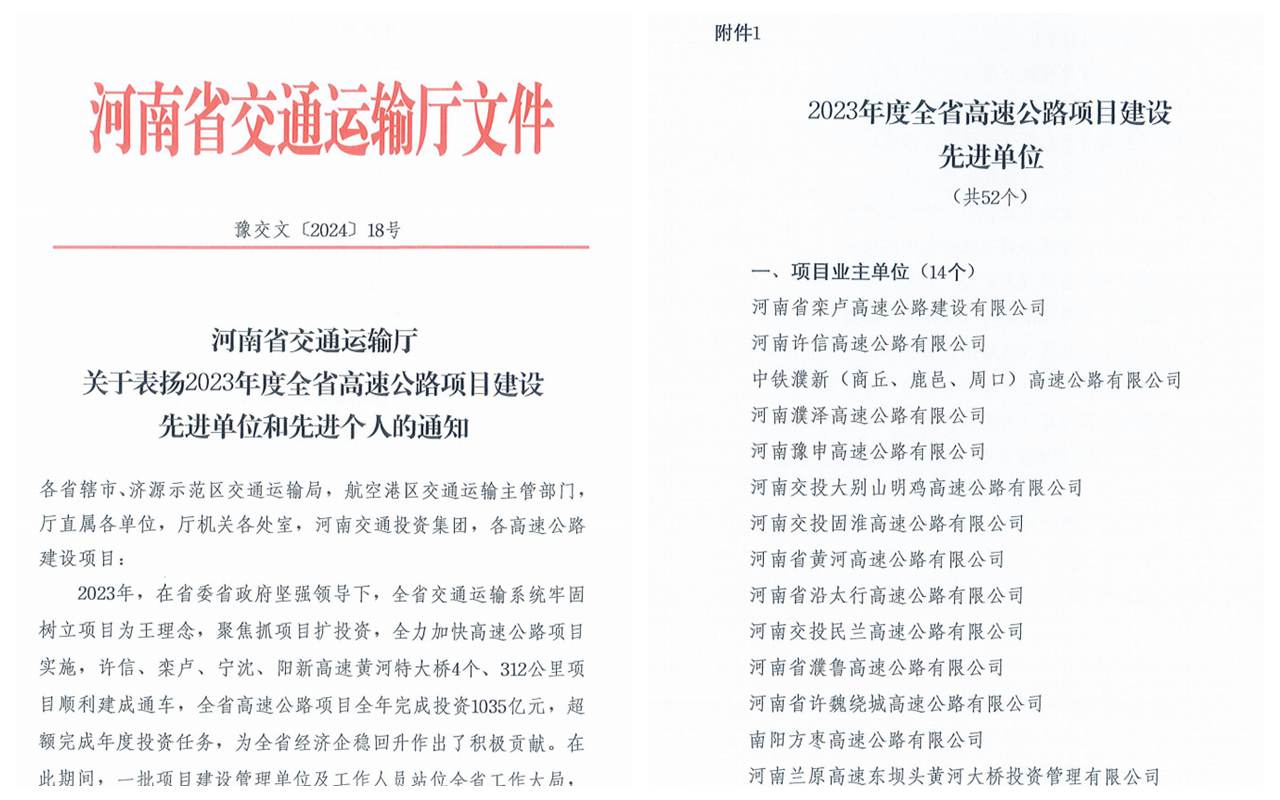 蘭封高速項(xiàng)目公司榮獲2023年度河南省高速公路項(xiàng)目建設(shè)先進(jìn)單位