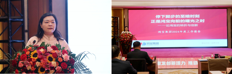 在認真聽取各位高管領導的總結發言后,集團總裁袁曉曦以 《停下腳步的至暗時刻,正是鴻寶向前的曙光之時》為題發表鴻寶集團 2024 年度工作報告。曉曦總從新時代的勢、鴻寶的轉折、 2024 年度工作總結、穿越自我周期找不足、2025 年度工作目標 等五個方面對鴻寶集團發展的時代環境、戰略定位、工作成績、 問題不足與發展目標等進行了深刻、系統、全面的總結剖析。